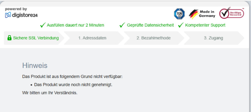 Noch nicht genehmigte Produkte werden im Bestellformular nur dann angezeigt, wenn man gleichzeitig bei Digistore24 eingeloggt ist.