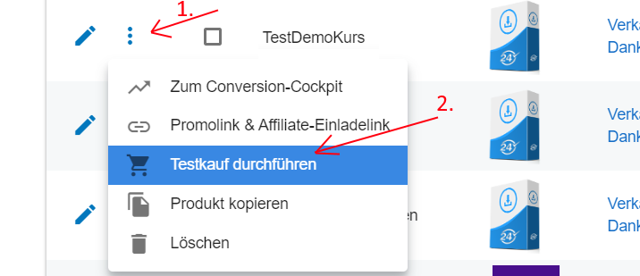 Um einen Testkauf durchzuführen, gibt es bei der Digistore24 Produktübersichtsseite beim Produkt einen Link (3 senkrechte Punkte, siehe Schritt 1. im folgenden Screenshot), klickst du darauf bekommst du unter anderem die Auswahl "Testkauf durchführen" (Schritt 2.). Hiermit kannst du testen, ob der vollautomatische Funnel auch tatsächlich funktioniert.